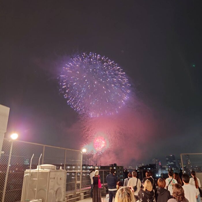 自由参加で本社屋上にて、お酒やつまみを楽しみながら花火を見ることができます。